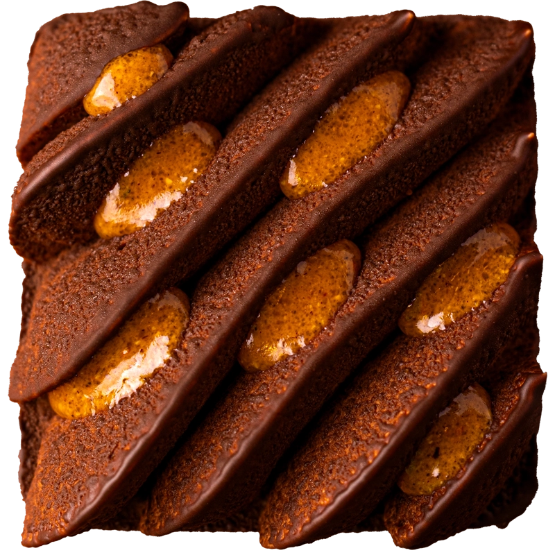 Ganache chocolat noir, croustillant praliné, biscuit noisette et mousse légère chocolat noir.