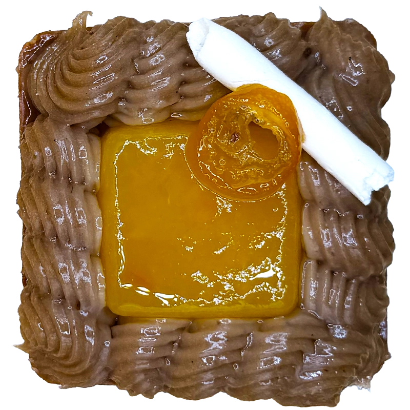 Croustillant aux marrons, crémeux marron, confit de clémentine–kumquat et crème de marrons.