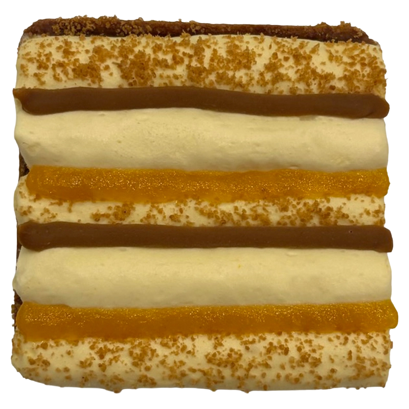 Croustillant spéculoos, crémeux spéculoos, confit de fruit de la passion et chantilly légère au fruit de la passion.