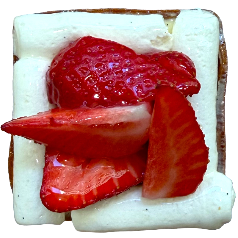Croustillant, confit de fraise, crème légère vanille, chantilly vanille et fraises fraîches.